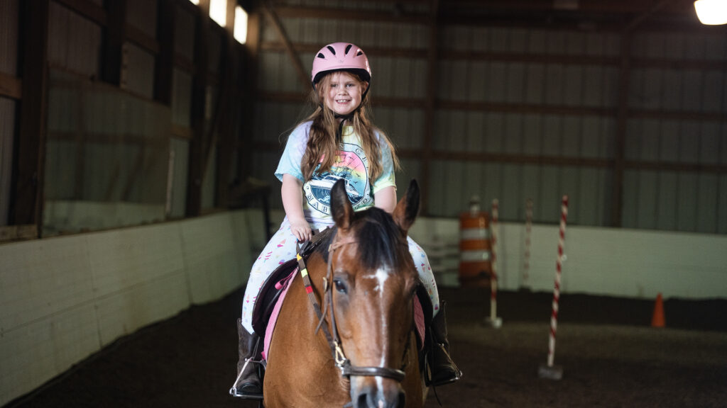 SunnyBrook Meadows boasts indoor and outdoor arenas alongside beautiful trails. Riders progress in a safe, supportive environment equipped with dependable horses and all necessary riding gear, including helmets.